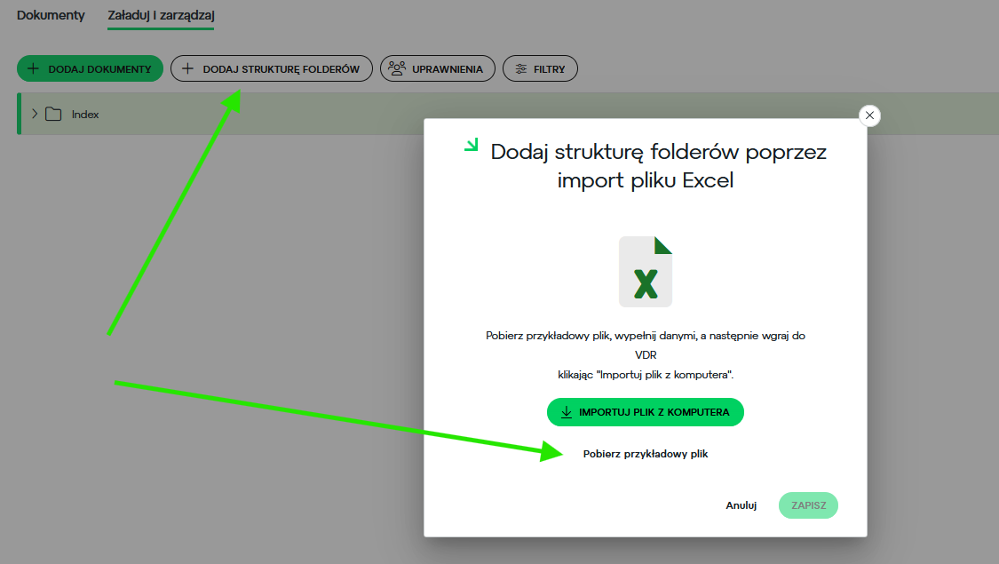 Przejdź do zakładki Dokumenty > Załaduj i zarządzaj, potem kliknij na przycisk Dodaj strukturę folderów i Pobierz przykładowy plik (rys. 3):
