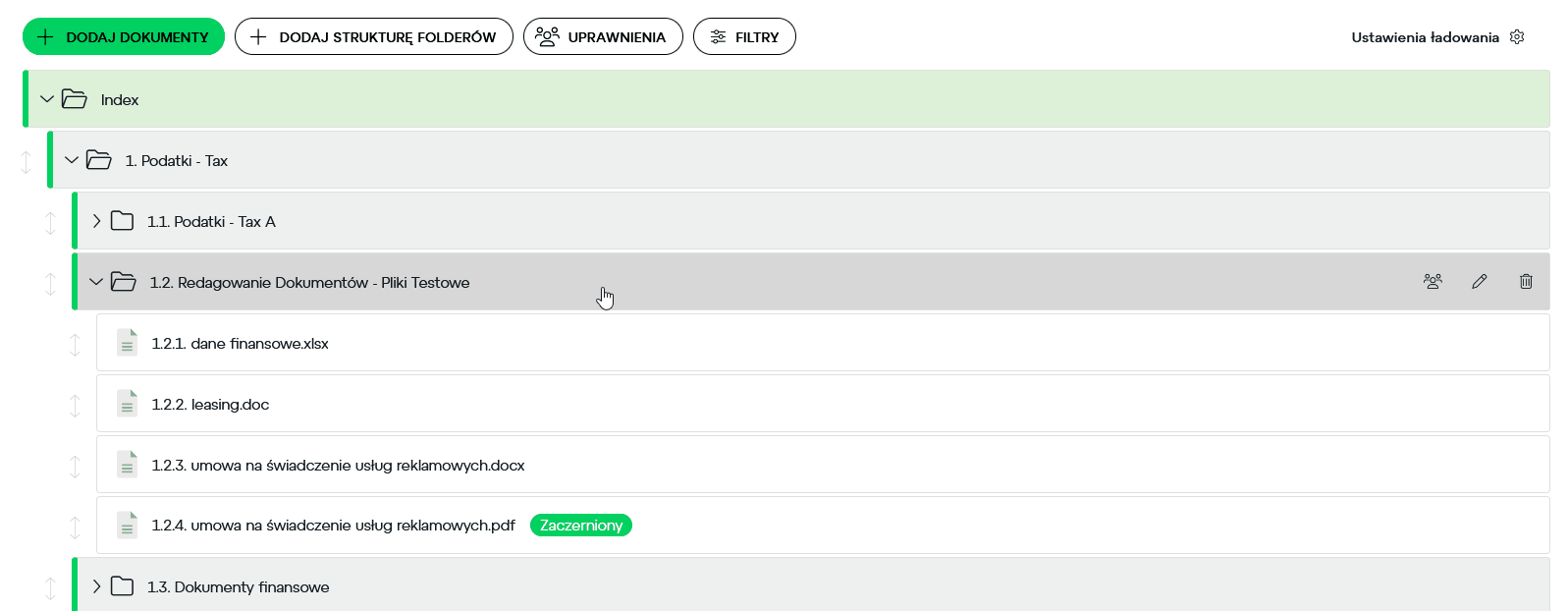 Jako Administrator możesz w rozbudowany sposób zarządzać katalogami drzewa struktury folderów oraz załadowanych dokumentów.