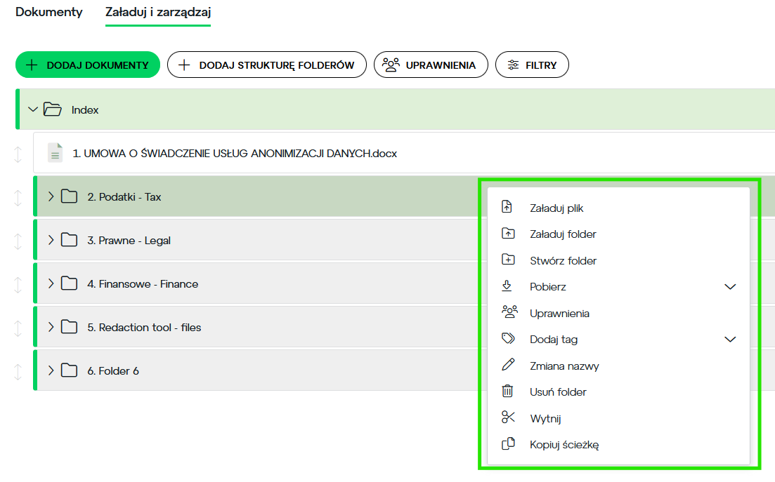 - Na początek kliknij na folder, gdzie planujesz załadować dokumenty, a następnie na zielony przycisk Dodaj dokumenty (rys. 3).