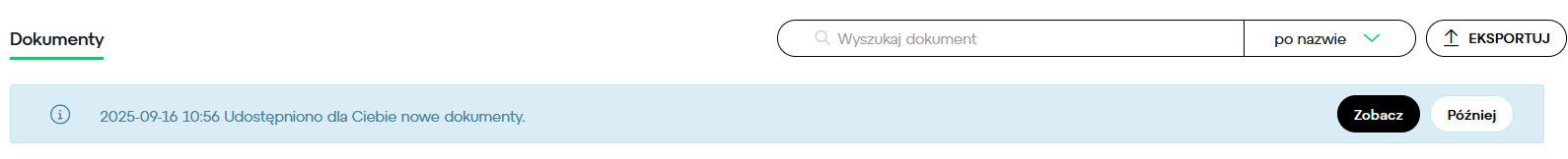 - Przejdź do zakładki Dokumenty. Na górze strony pojawi się niebieski baner informujący o tym, że są dla Ciebie dostępne nowe dokumenty do przejrzenia. Kliknij na Zobacz, aby przejść do pełnej listy (rys. 2).