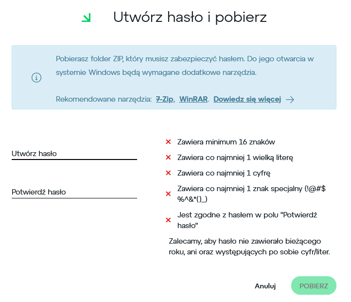 Aby rozpakować pobierany ZIP należy użyć odpowiednich narzędzi obsługujących szyfrowane archiwa ZIP.